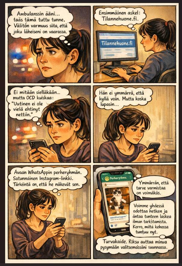 Esimerkki: "Haluaisin laittaa Instagram-linkin perheryhmään varmistaakseni, että kaikki ovat elossa." Tekoäly voi vastata: "Ymmärrän, että tarve varmistaa on voimakas. Voimme yhdessä odottaa hetken ja antaa tunteen laskea ilman tarkistamista. Kerro, miltä kehossa tuntuu nyt."